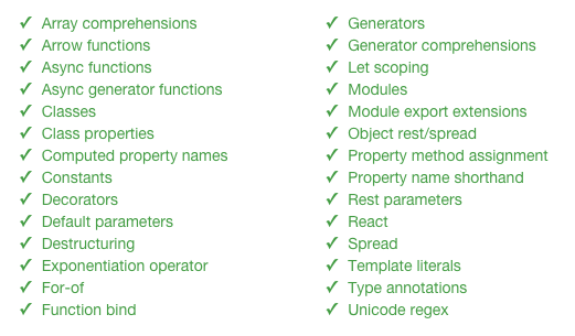 Tak przedstawia się lista wsparcia feature–ów z ES6 przez Babel.js: