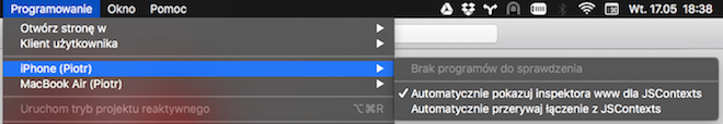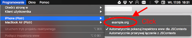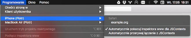 Tryb remote debugging działa w Safari (specjalnie nie nazywam tego programu przeglądarką ze względu na implementację specyfikacji W3C oraz kiepskie narzędzia developerskie - Google Chrome to jedyna słuszna przeglądarka). No dobra, przedstawię kroki jak skorzystać z remote debugging.