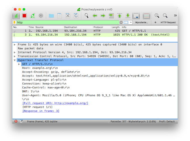 Ryc. 13. Request HTTP do strony example.org widziany w programie Wireshark.