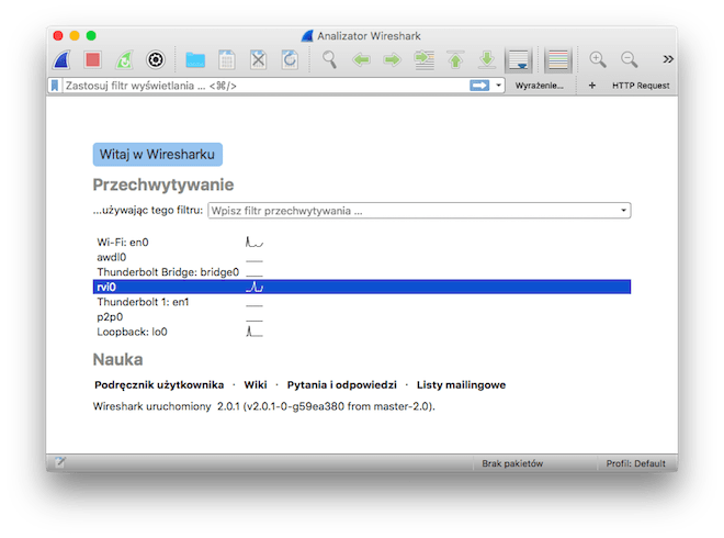 Resetujemy Wiresharka, a w nowej sesji programu widzimy listę interfejsów z nowym rv0: