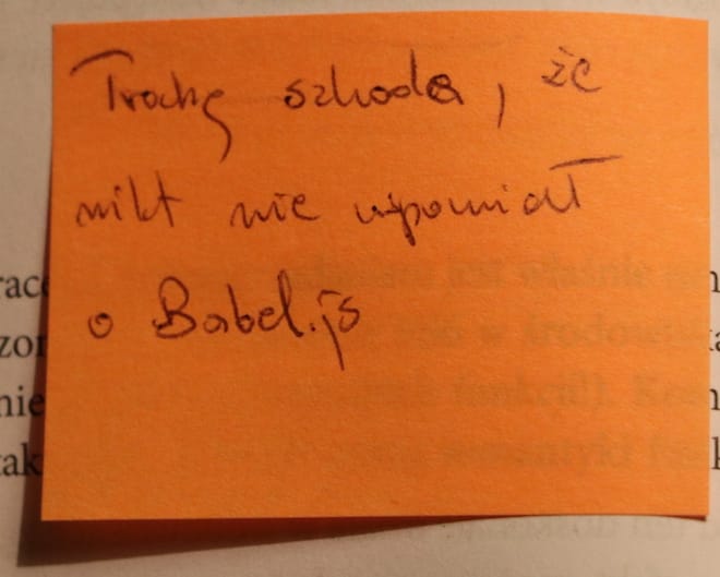 Może trochę słów o książce. Czytało mi się ją szybko. Nie miałem jakiś problemów ze zrozumiem, o co autorowi chodzi. Książka dla mnie jest odświeżeniem tematu zakresów i domknięć. Polecam ją każdemu, kto zaczyna swoją przygodę z JavaScriptem.