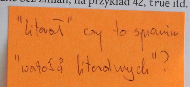 Według Wikipedii, słowem literał oznaczana jest jednostka leksykalna reprezentująca ustaloną wartość (liczbową, tekstową itp.) wpisaną przez programistę bezpośrednio w danym miejscu w kod programu. (…) Poza tym funkcje anonimowe są literałami dla typu funkcyjnego. (…) W przeciwieństwie do literałów, stałe i zmienne są identyfikatorami (…).