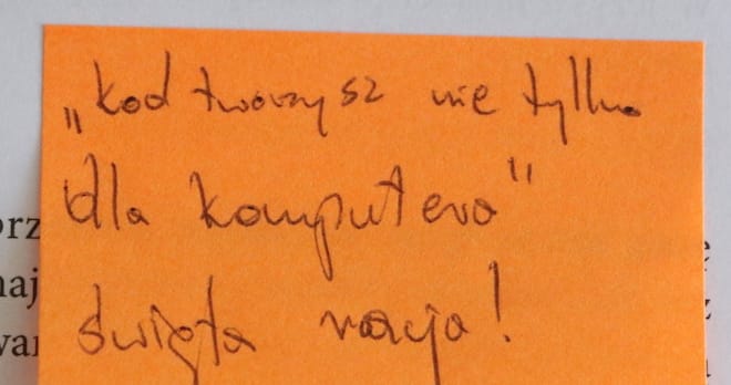 To zdanie to jest święta racja. Kod, który piszemy, nie piszemy dla komputera, on jest dla nas, developerów. Komputer zrozumie dziwną składnię, człowiek już nie.