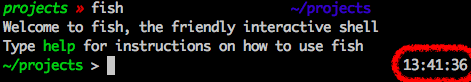 promptjest to tzw. znak zachęty. Znajduje się on zawsze po lewej stronie. Od tej wartości zaczyna się linia w której na końcu mam ustawiony kursor, gdzie możemy coś wpisać. Jednak co jeśli chcielibyśmy wpisać coś po prawej stronie? Mamy możliwość poprzez funkcję:function fish_right_prompt echo (date '+%H:%M:%S) endJak to będzie wyglądało w praktyce? Poniżej przykład.