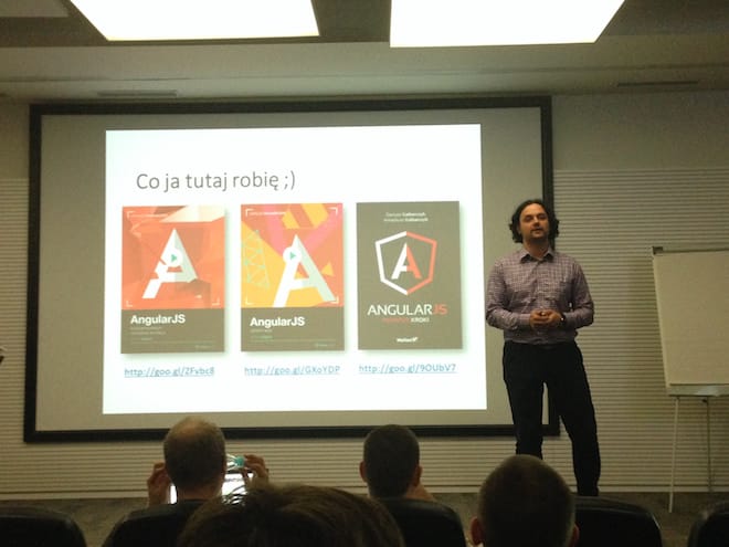Podczas spotkania wysłuchaliśmy 4 prelekcji. A jedną z nich poprowadził nawet organizator całego zamieszania, Darek Kalbarczyk. Wszystkie prelekcje były zorientowane na framework AngularJS autorstwa Misko Havery’ego, Adam Abrons’a, pracujących w organizacji Google.
