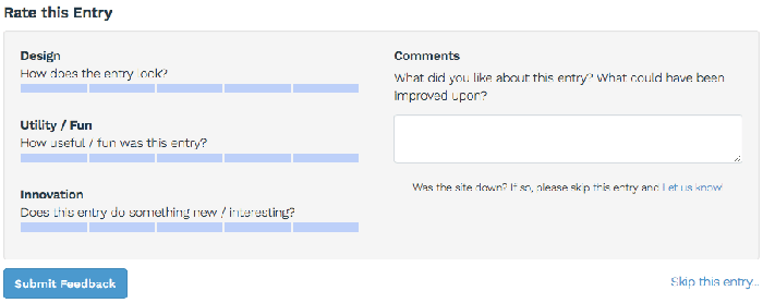 Głosować na nią można na stronie https://www.nodeknockout.com/entries/170-dumplings poprzez kliknięcie przycisku FAVOURITE albo jeśli byłeś zawodnikiem tych zawodów poprzez uzupełnienie formularza: