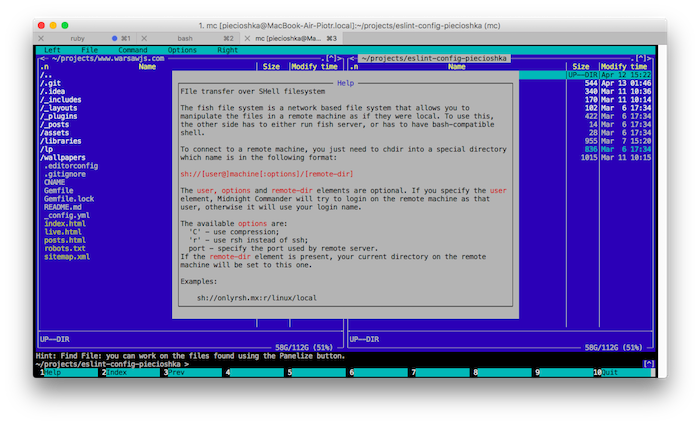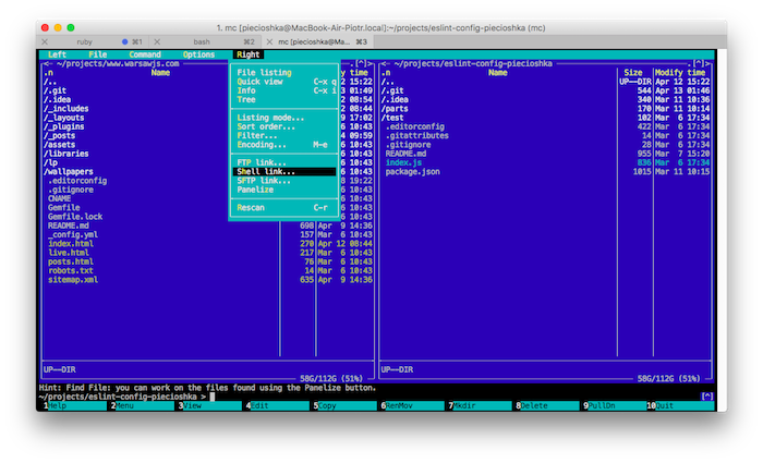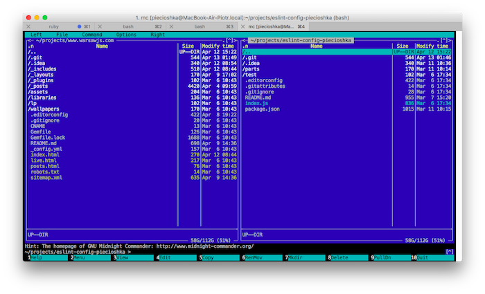 Czasami wykorzystuję jeszcze Midnight Commandera do porządkowania plików i katalogów na dysku prywatnego komputera, bo przenoszenie folderów za pomocą touchbara nie zawsze jest najszybszym rozwiązaniem.