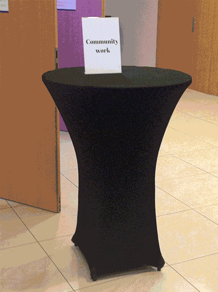 Podczas konferencji na stolikach “barowych” stały tabliczki z nazwami technologi o których się rozmawiało. Można było porozmawiać o takich technologiach jak: React.js, HTML5, Angular, RxJS czy Vue.js które ściągnęło największą liczbę chętnych do rozmowy.