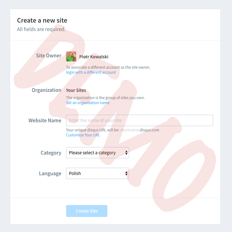 Your Sitesa następnie naNew.Powinniśmy być na stronie disqus.com/admin/create