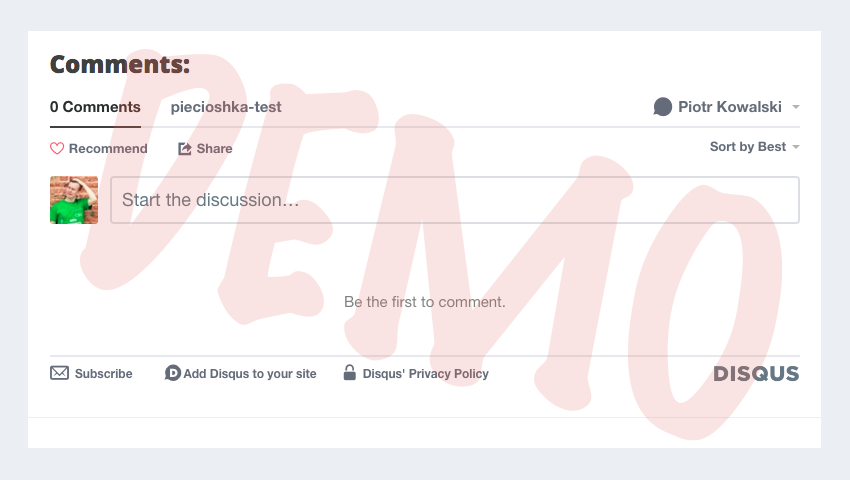 _config.ymlna dole strony dodajemy:theme_config: comments: disqus_shortname: piecioshka-testJeśli już wcześniej istniał klucz