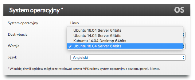 Kiedy przychodzi mi do wyboru szczegółów zamówienia (a jednym z nich jest wybór zainstalowanego systemu operacyjnego) widzę opcję 18.04!